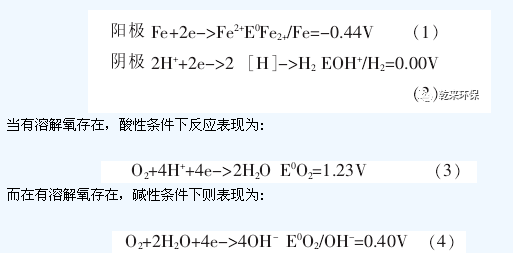 所用材料的鑄鐵屑和活性碳或焦碳,鑄鐵屑是鐵和碳的合金,其內(nèi)部主要由純鐵和碳化鐵(Fe3C)組成,其中Fe3C以極為細(xì)小的微粒分散在鐵屑內(nèi)。當(dāng)將鑄鐵鐵屑浸沒在電解質(zhì)溶液中時(shí),由于Fe3C比純鐵更耐腐蝕,二者之間存在著明顯的氧化還原電勢(shì)差,這樣便在純鐵和碳化鐵之間形成了無數(shù)多個(gè)細(xì)微原電池,純鐵為陽極,F(xiàn)e3C為陰極。另一方面鐵屑與活性碳形成較大的原電池,鑄鐵為陽極,碳為陰極,使鐵屑在受到微原電池腐蝕的基礎(chǔ)上,又受到較大原電池的腐蝕。在這些細(xì)微原電池中,陽極在電池反應(yīng)中表現(xiàn)為失去電子被氧化,而陰極得到電子被還原,但反應(yīng)比較復(fù)雜。在微電池中電極反應(yīng)為: